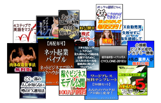 ほとんどの商材に再配布権が付いていますので、ご自身で利用の他にもアフィリエイトの特典などにご利用いただけます。